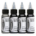 Introducing an essential addition to every artist s color palette a set of four opaque neutral gray inks! For the black & gray artist looking to create a smooth opaque gradation, these four inks are evenly spaced at 20%, 40%, 60% and 80% of black on the value scale. Color artists will love the neutral grays for toning down any color without a having a shift in color hue. Adding this set allows an artist to extend their color palette with a wider range of tones and shades.